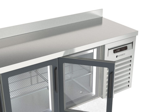 - Encimera de acero inox AISI-304 con frente recto y peto trasero sanitario de 100 mm (opcional sin peto)