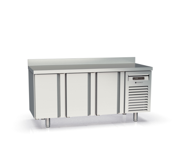 - Plan de travail en acier inoxydable AISI-304 avec façade droite et dosseret sanitaire de